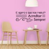 Este modelo, Adesivo de Parede Acreditar Sempre, pode ser usado em praticamente qualquer superfície lisa, pode ser utilizado para decorar quarto infantil, sala, sala de estar, sala de tv, cozinha, hall de entrada, quarto de casal, bar, espaço gourmet, cabeceira de cama, escritório, banheiro, box de banheiro, etc...