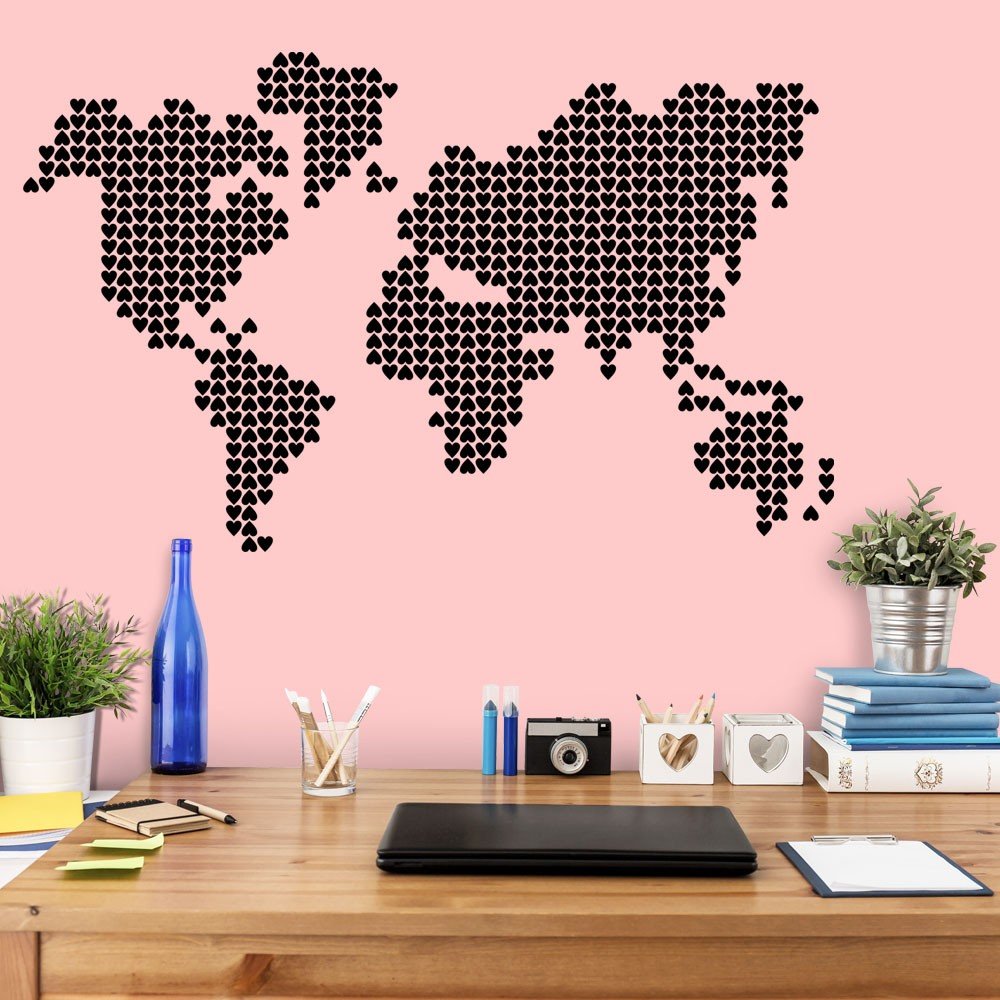 Este modelo, Adesivo de Parede Mapa Corações, pode ser usado em praticamente qualquer superfície lisa, pode ser utilizado para decorar quarto infantil, sala, sala de estar, sala de tv, cozinha, hall de entrada, quarto de casal, bar, espaço gourmet, cabeceira de cama, escritório, banheiro, box de banheiro, etc...