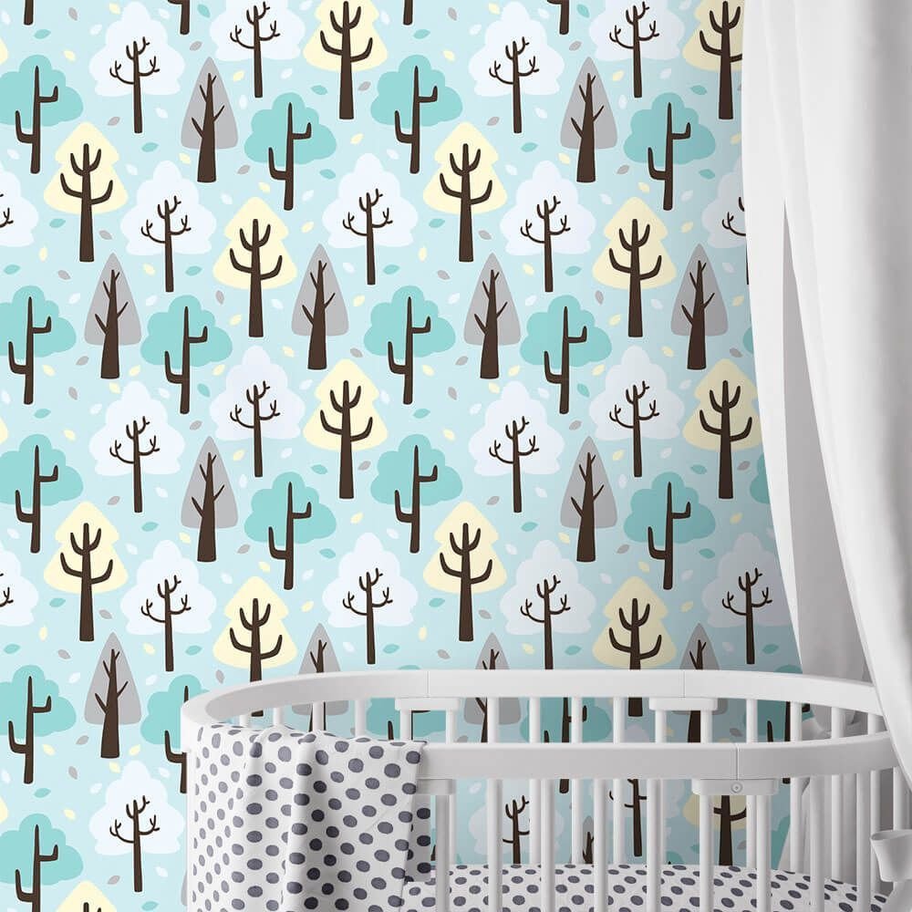 O Papel de Parede Árvores Fofas Baby é fabricado em adesivo vinil fosco 3M, autocolante e com excelente qualidade de impressão. Não precisando de cola.