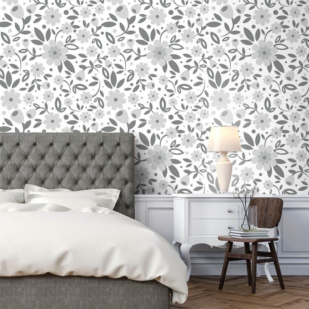 O Papel de Parede Big Flowers Gray é fabricado em adesivo vinil fosco 3M, autocolante e com excelente qualidade de impressão. Não precisando de cola.