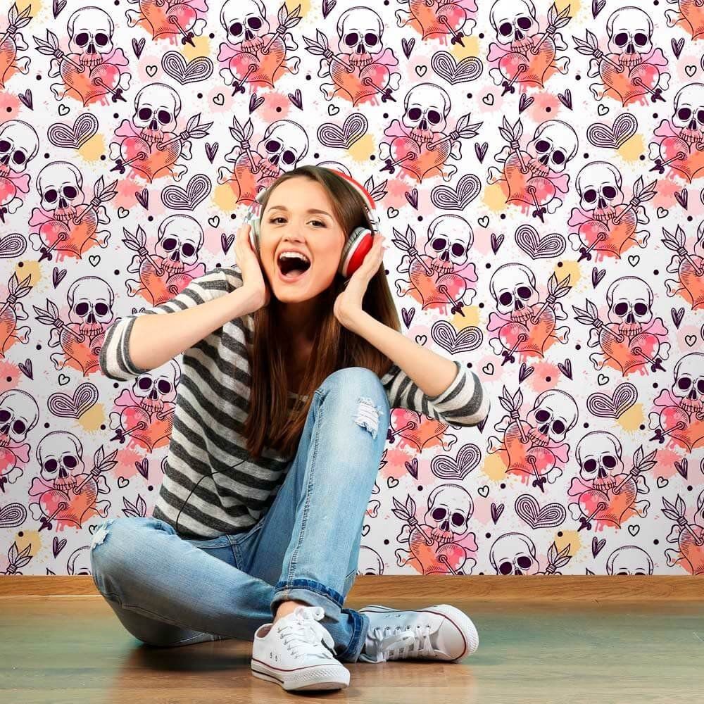 O Papel de Parede Caveira Lovers é fabricado em adesivo vinil fosco 3M, autocolante e com excelente qualidade de impressão. Não precisando de cola.