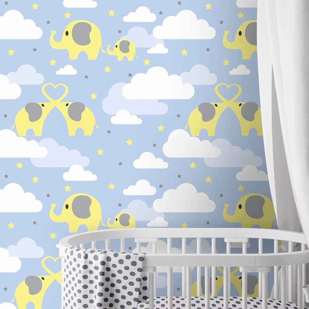 O Papel de Parede Elefantes nas Nuvens Boy é fabricado em adesivo vinil fosco 3M, autocolante e com excelente qualidade de impressão. Não precisando de cola.