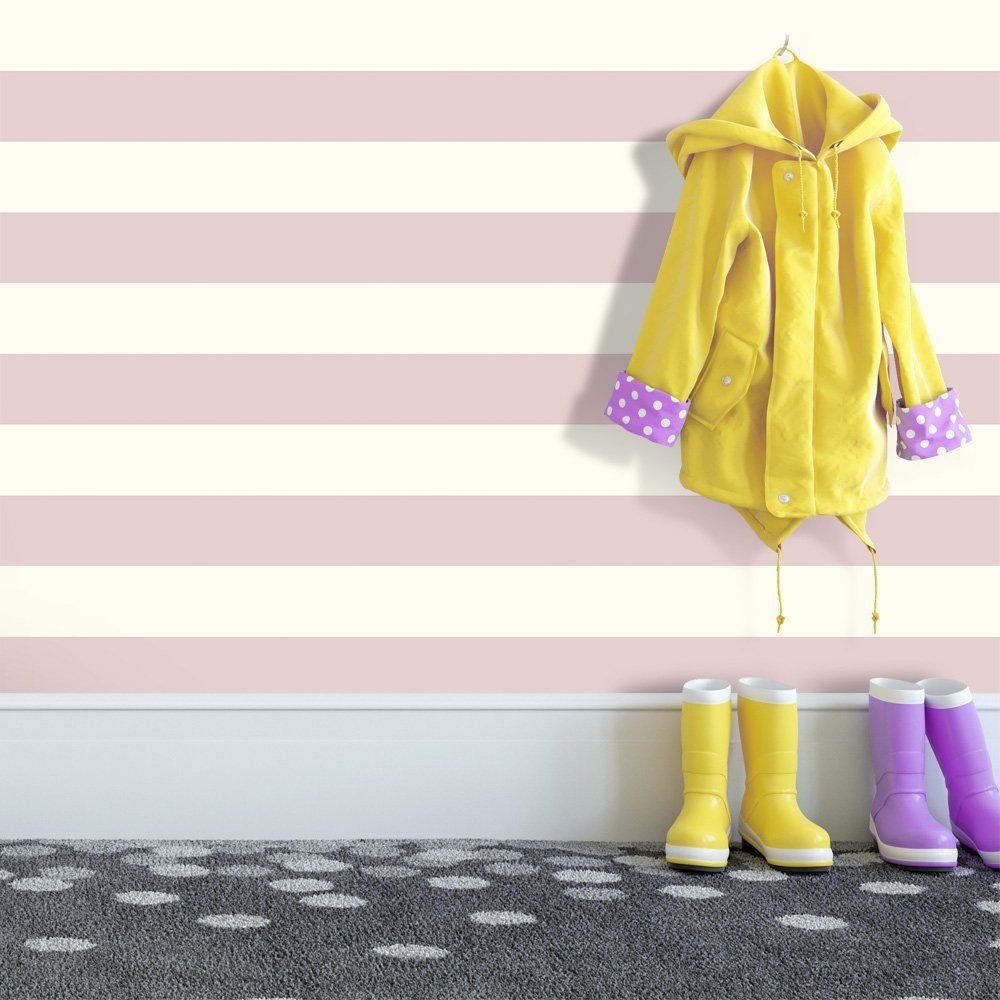 O Papel de Parede Faixas Sofia é fabricado em adesivo vinil fosco 3M, autocolante e com excelente qualidade de impressão. Não precisando de cola.
