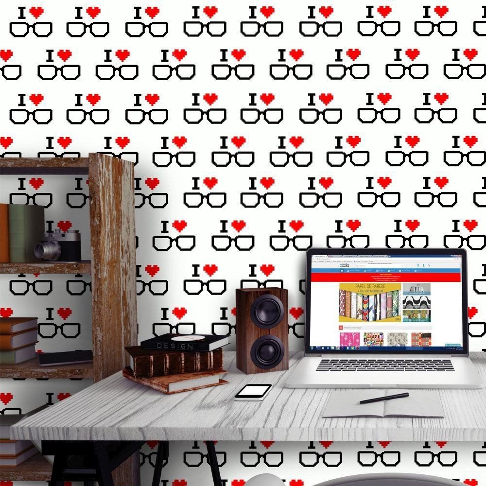 O Papel de Parede I Love Geek é fabricado em adesivo vinil fosco 3M, autocolante e com excelente qualidade de impressão. Não precisando de cola.
