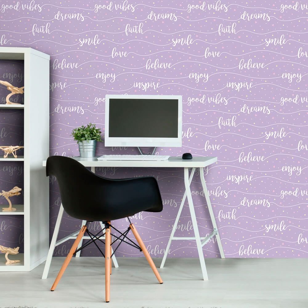 O Papel de Parede Leveza Lilás é fabricado em adesivo vinil fosco 3M, autocolante e com excelente qualidade de impressão. Não precisando de cola.
