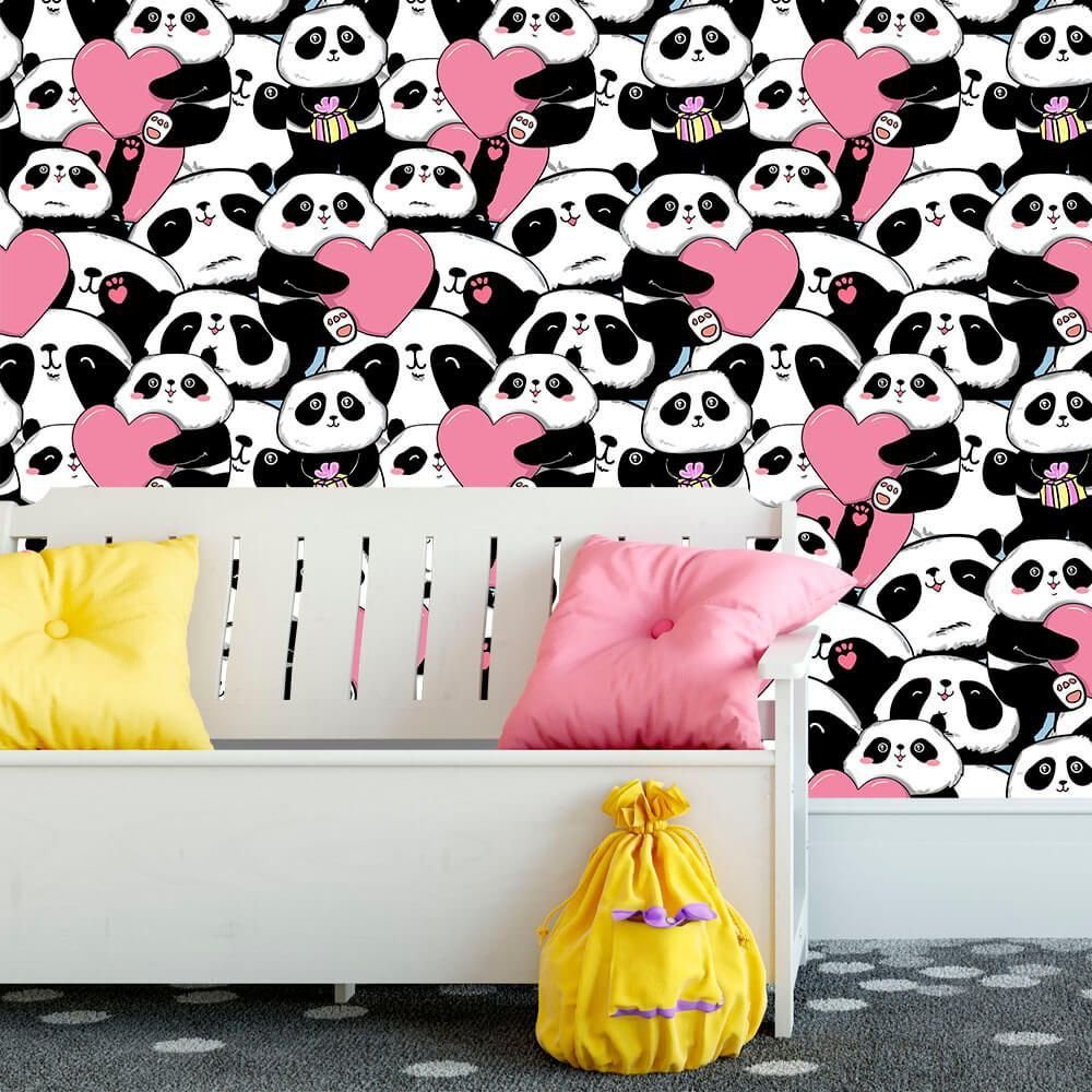 O Papel de Parede Panda Coração é fabricado em adesivo vinil fosco 3M, autocolante e com excelente qualidade de impressão. Não precisando de cola.