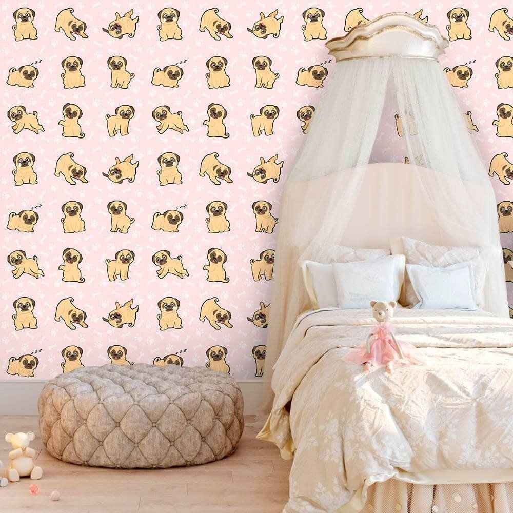 O Papel de Parede Pug Girl é fabricado em adesivo vinil fosco 3M, autocolante e com excelente qualidade de impressão. Não precisando de cola.